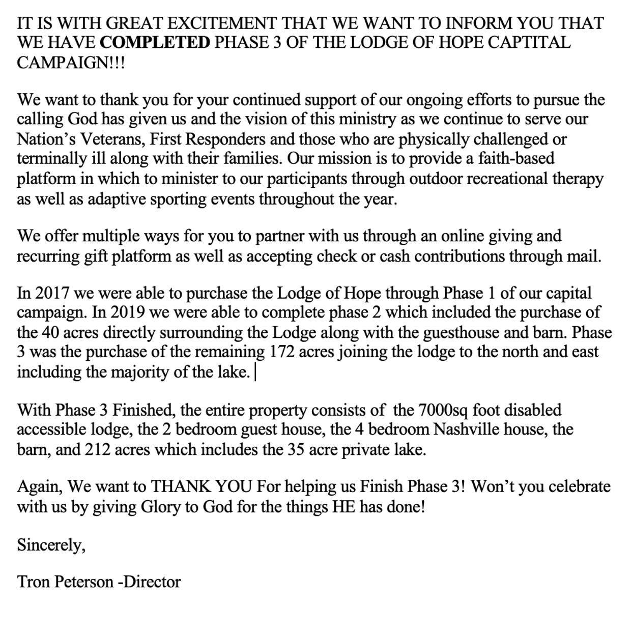 The Lord has been mighty in his blessings and goodness to get us to the point we are today! Everything that has been accomplished has been done entirely through donations! Including the sponsorship of 40 - 45 events per year, to the purchasing of the first 2 phases of the 200 acre Lodge of Hope property, the finishing of the Lodge, and most recently completing the Nashville House. Faith most certainly does move mountains!!